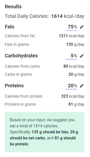 In the example above, you can consume 1614 calories per day to meet your goal weight. Let’s break down what this looks like when we divide the calories into 75% fats, 5% carbohydrates, and 20% protein.