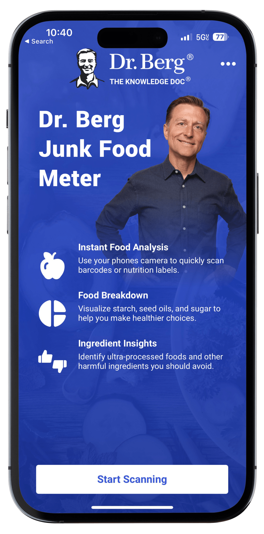 The Dr. Berg Junk Food Meter app helps you spot harmful ingredients, ultra-processed additives, and hidden sugars–right from your phone. View more details.